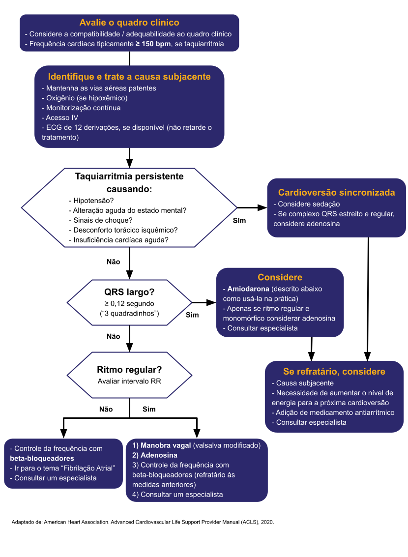 - É permitido tentar uma dose de adenosina antes da cardioversão, apenas se ritmo for regular e monomórfico e não for atrasar a cardioversão.