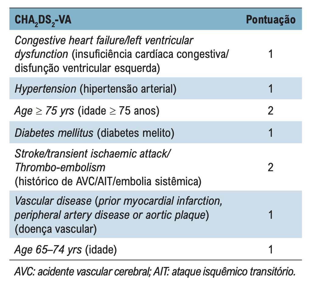 - Observação: era anteriormente chamado de CHA2DS2-VAsC. A iniciativa da Sociedade Europeia de Cardiologia para a mudança da nomenclatura do escore, abolindo o sexo feminino do sistema de pontuação, reside no fato de ser um fator modificador de risco, além de excluir um grupo grande de pacientes com identidade não binária, transgêneros ou em uso de terapia hormonal.
