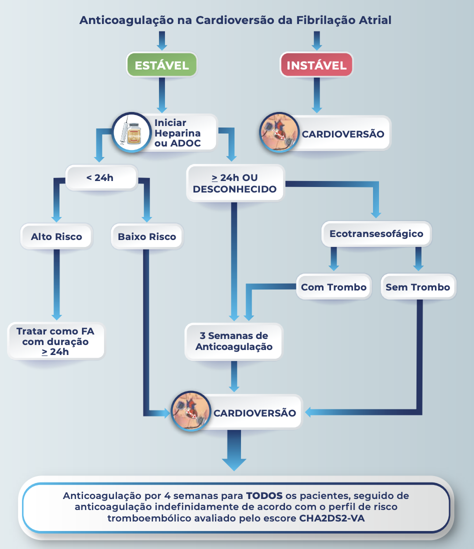 - Após 3 semanas de anticoagulação OU ecocardiograma transesofágico sem trombo -> cardioversão elétrica ou química + anticoagulação por mais 4 semanas.