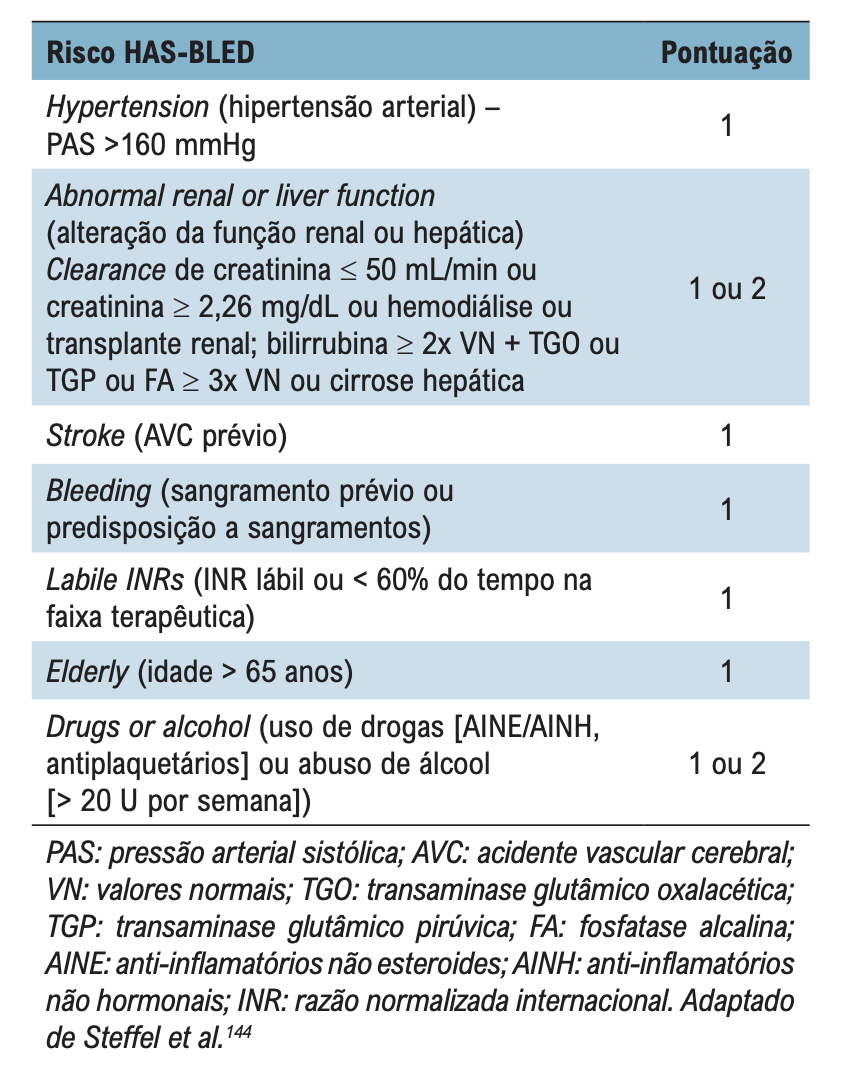 - Escore ≥ 3: indicam alto risco de sangramento (mas não constituem contraindicação à terapia anticoagulante).