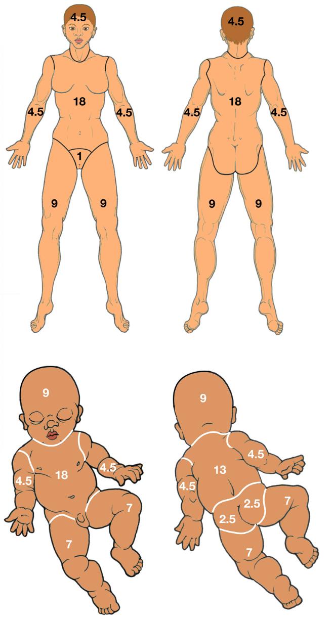 - Para queimaduras irregulares, usar a palma da mão do paciente como referência (≈1%).