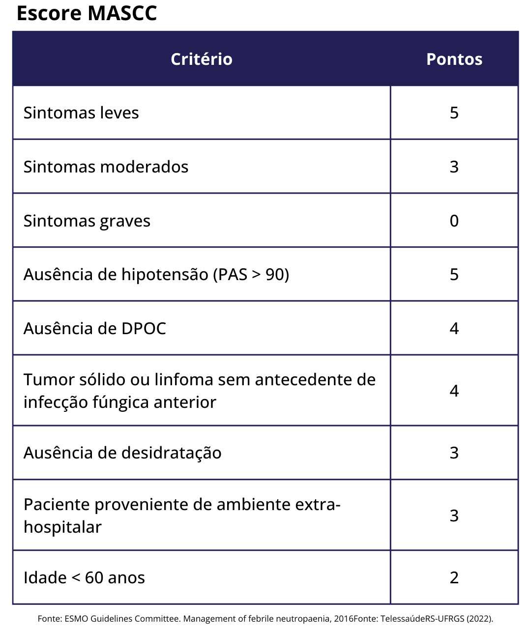 - Pontuação < 21 no escore MASCC.