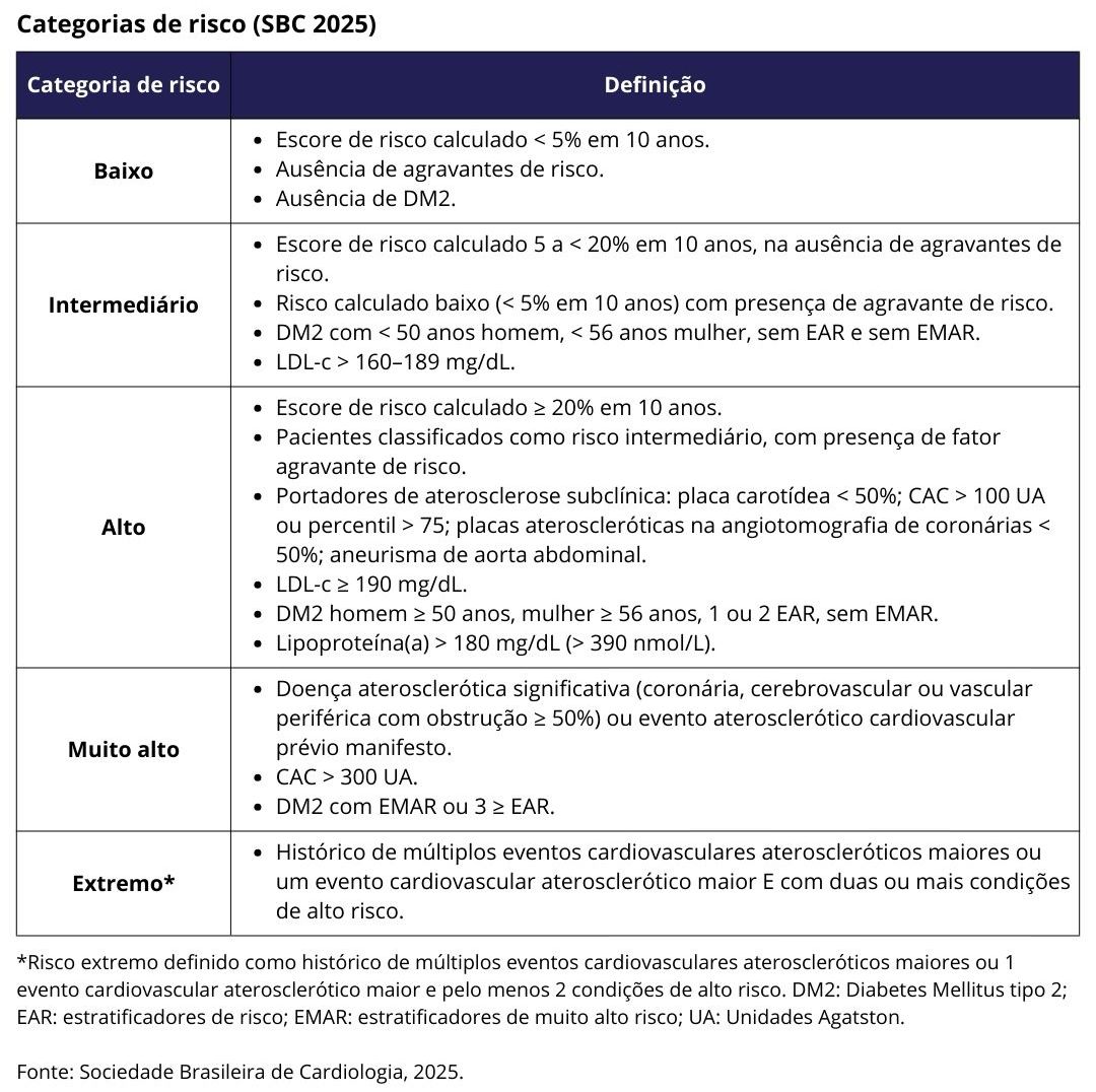 - A diretriz da SBC de 2025 preconiza terapia combinada precoce como estratégia inicial, com a combinação de estatina + ezetimiba ± anti-PCSK9, em pacientes de alto, muito alto ou extremo risco.
