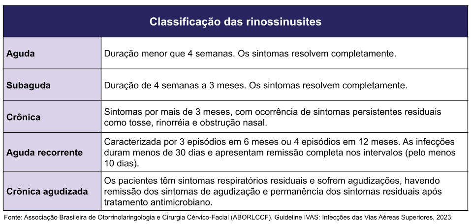 O termo rinossinusite é empregado na prática clinica considerando que a rinite (sintomas originários na cavidade nasal) e a sinusite (sintomas originários dos seios paranasais) são doenças em continuidade.