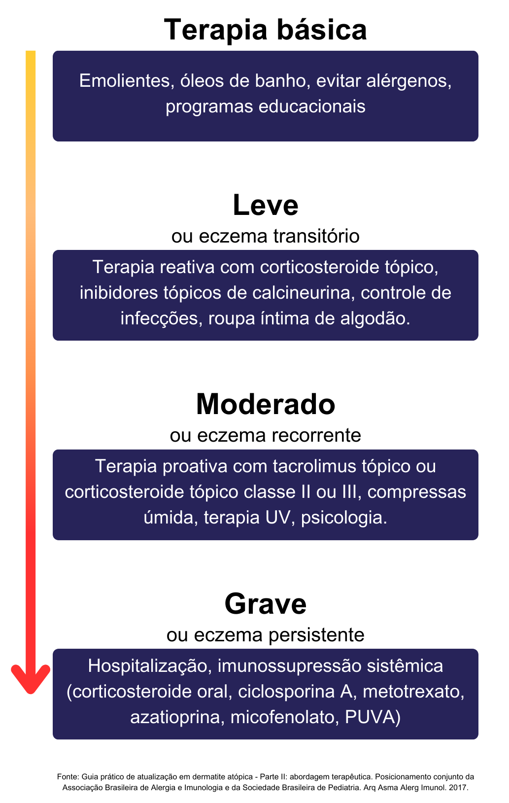 Guia prático de atualização em dermatite atópica - Parte II: abordagem terapêutica. Posicionamento conjunto da Associação Brasileira de Alergia e Imunologia e da Sociedade Brasileira de Pediatria. Arq Asma Alerg Imunol. 2017.